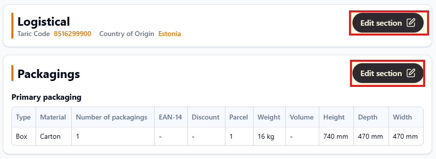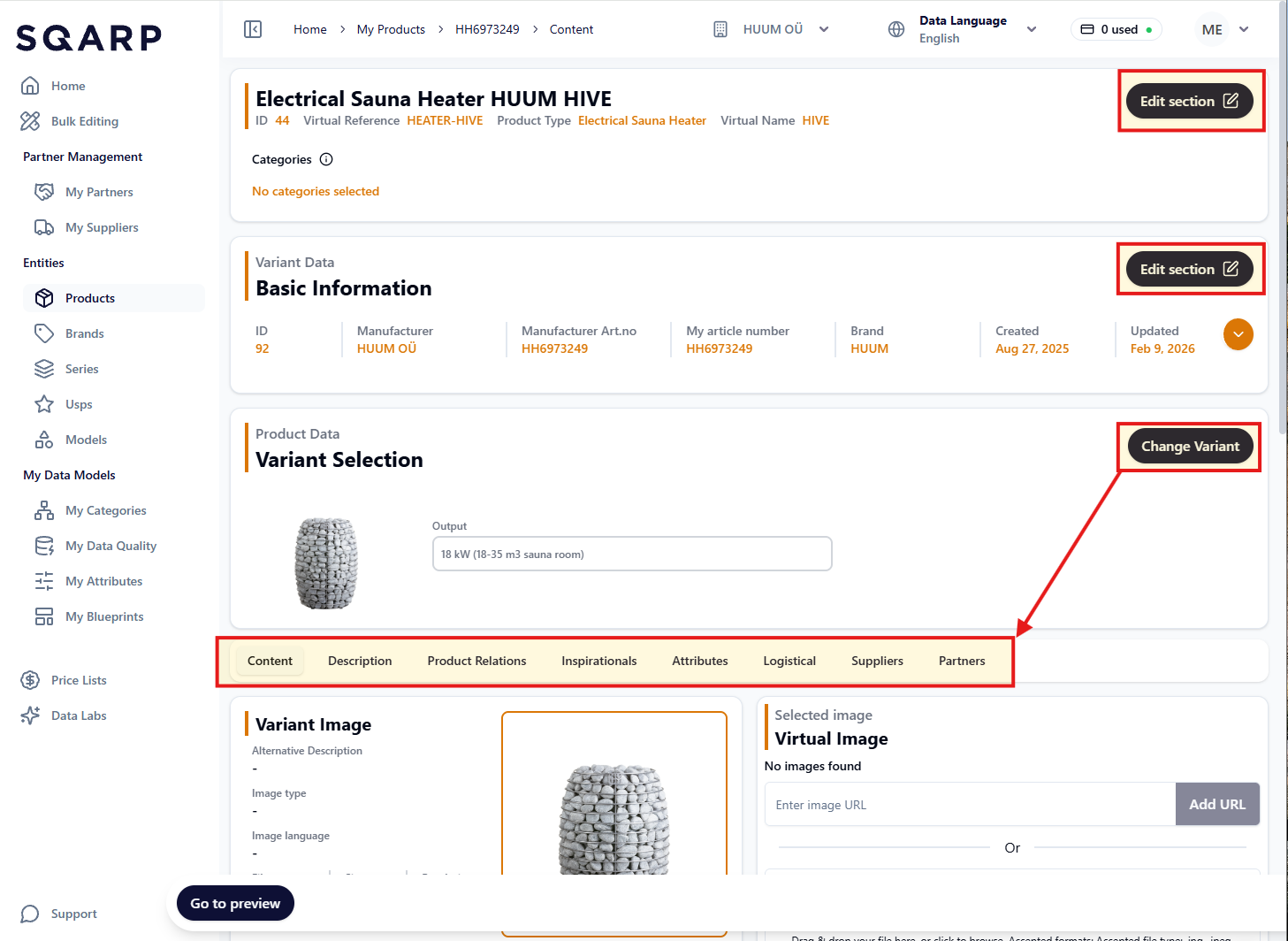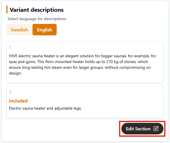 Under you can edit the Variant Data (data connected to each product. To toggle between different variants, click on Change variant. Click Edit section to change: