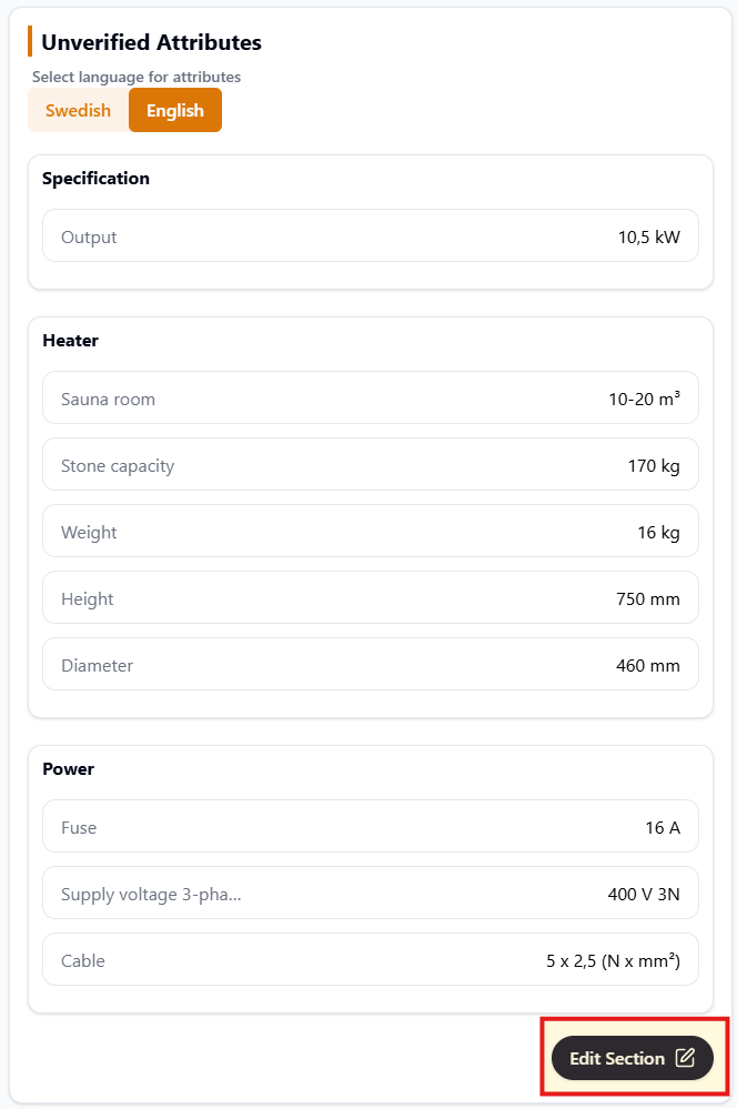 Add or remove your products connection to a Brand / Model / Series / USP by clicking Edit section. A product can be connected to several Models / Series / USPs but only one (1) Brand.