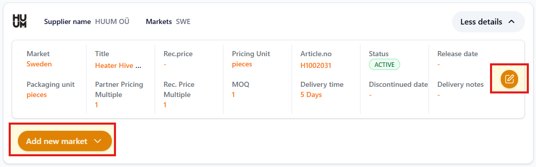 Edit the market specific information or add information for a new market: