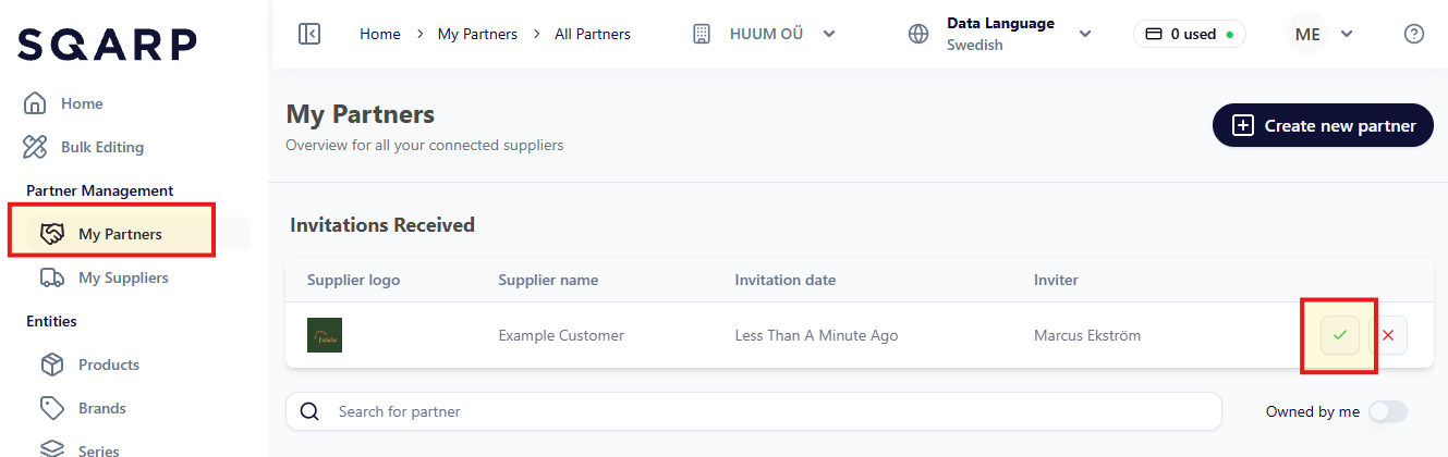 If your partner is using SQARP they might have sent you a Partnership request. The partnership then already comes pre-configured and is for you to accept or decline.